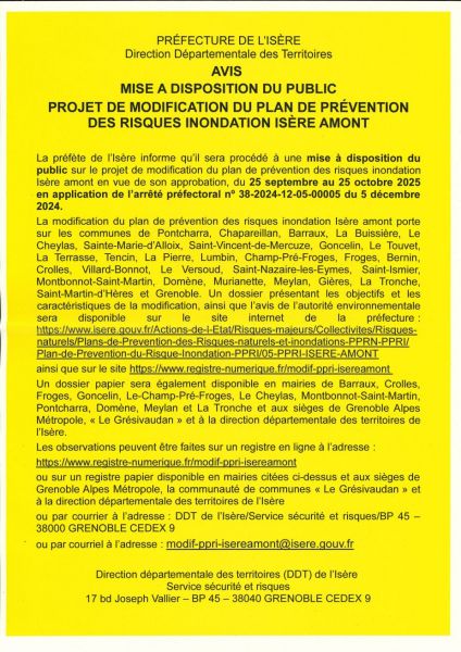 Le projet de modification du PPRI Isère amont sera consultable en mairie du 25 septembre au 25 octobre 2025 aux heures d'ouverture.